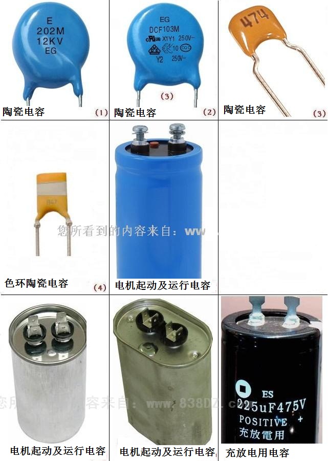 ↓图1、2、3 陶瓷电容器;图4 色环陶瓷电容;图5、10、11,电机起动及运行电容器;图12 充放电用电容