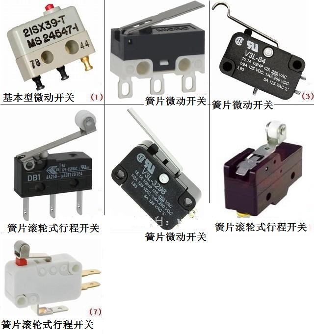 ↓图1 基本型微动开关;图2、3、5 簧片微动开关;图4、6、7 簧片滚轮式行程开关