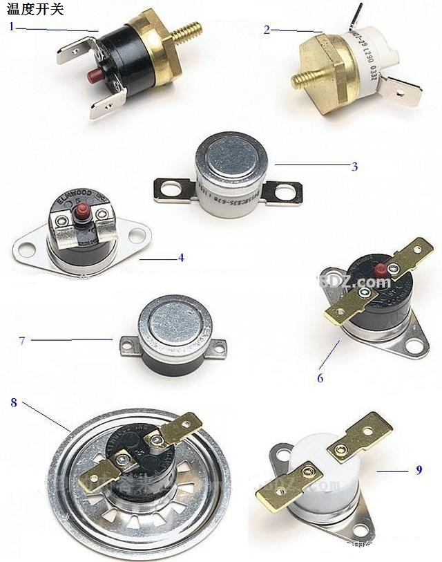 温度开关是一种用双金属片作为感温元件的温度开关,电器正常工作时,双金属片处于自由状态,触点处于闭合/断开状态,当温度升高至动作温度值时,双金属元件受热产生内应力而迅速动作,打开/闭合触点,切断/接通电路,从而起到热保护作用。当温度降到重定温度时触点自动闭合/断开,恢复正常工作状态。广泛用于家用电器电机及电器设备,如洗衣机电机、空调风扇电机、变压器、镇流器、电热器具等。