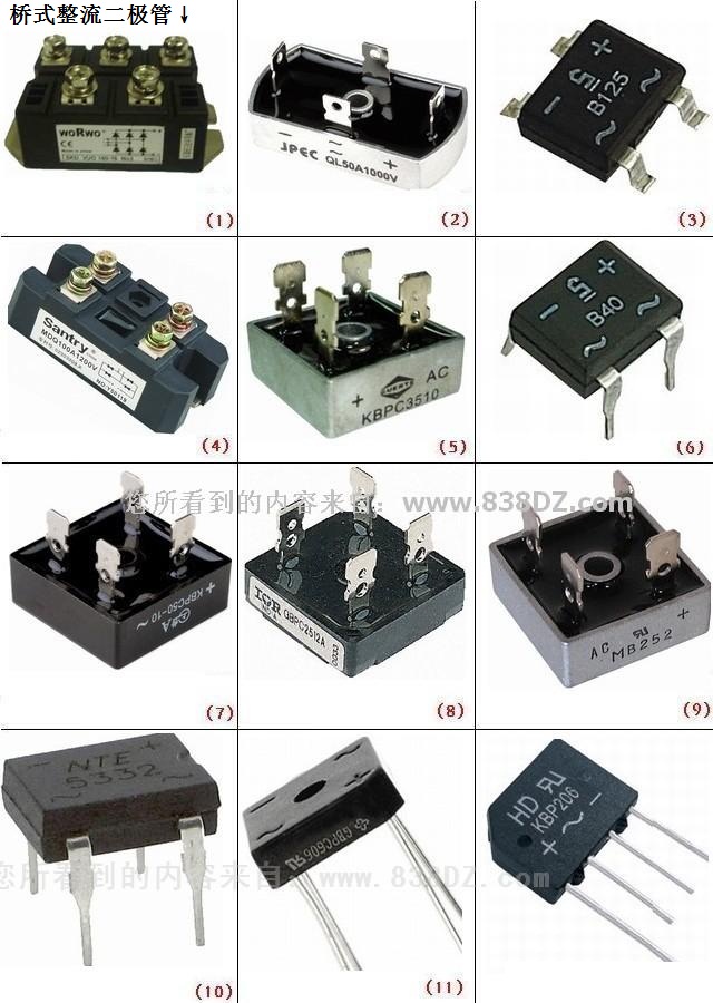 ↓图1 一般指高压二极管;图2 汽车发电机用二极管;图3、5 玻璃封装小电流二极管;图4 砷化镓红外发光二极管;图6 激光二极管;图7 双二极管;图8 大电流二极管模块;图9 大电流二极管;图10、11 发光二极管数码管