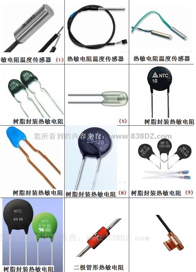 ↓图1、2、3 热敏电阻温度传感器;图4、6、7、8、9、10 树脂封装热敏电阻;图5 玻璃封装热敏电阻;图11 二极管形热敏电阻