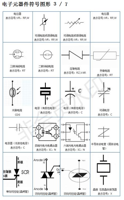 目录 一、电阻 二、电位器 三、电容 四、电感 五、二极管 六、三极管 七、轻触按键开关 八、微动开关 九、温度开关 十、继电器 十一、温度保险丝 十二、可控硅 十三、声表面滤波器 十四、桥式整流二极管 十五、光电器件 十六、电子元器件符号图形